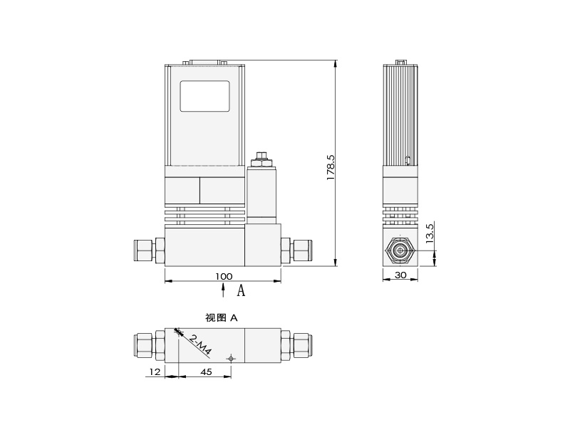 系 列 ACU10FCH 型号 LC LM MC MM BC BM 量程范围 气体:0-(2,5,10...1000)SCCM, 0-(1,5,10...30)SLM 气体:0-(30,40,50...300)SLM 气体:0-(300,400,500...3000)SLM 液体:0-(2,5,10...500)SCCM 液体:0-(500,600...1000)SCCM, 0-(1,2,3...10)SLM 液体:0-(1,2,30...10)SLM 蒸汽:0-(2,5,10...1000)SCCM, 0-(1,2,3...10)SLM 0-(10,20,30...100)SLM 0-(100,150,200...500)SLM 准确度 ±1.0%F.S 重复性 ±1%F.S 零点漂移&满量程漂移 0.02% F.S/ ºC/Atm 工作差压 0.1~0.5MPa(订货时指定) 量程比 50:1 100:1 50:1 100:1 50:1 100:1 典型响应时间 200 毫秒(可调整) 模拟量 0~5V、4~20mA 数字量 RS232/485,MODBUS协议 供电 24VDC 工作温度 +10~+50℃ 工作压降 <0.01Mpa 工作压力 <1MPa 电气连接 DB15孔 防护等级 IP40 漏率 1×10-9Pa m³/S 阀门 阀门长闭 / 阀门长闭 / 阀门长闭 / 底座材质 不锈钢 密封材质 氟橡胶,丁腈橡胶,三元乙丙,全氟醚 表体螺纹 G3/8内螺纹 G1/2内螺纹 接头 卡套、宝塔、快插、VCR、法兰等 四、产品尺寸图